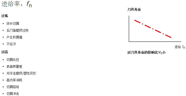 - 切深 (根据工件材料,更大的切深将影响断屑,从而产生更大的力来断屑和排屑)