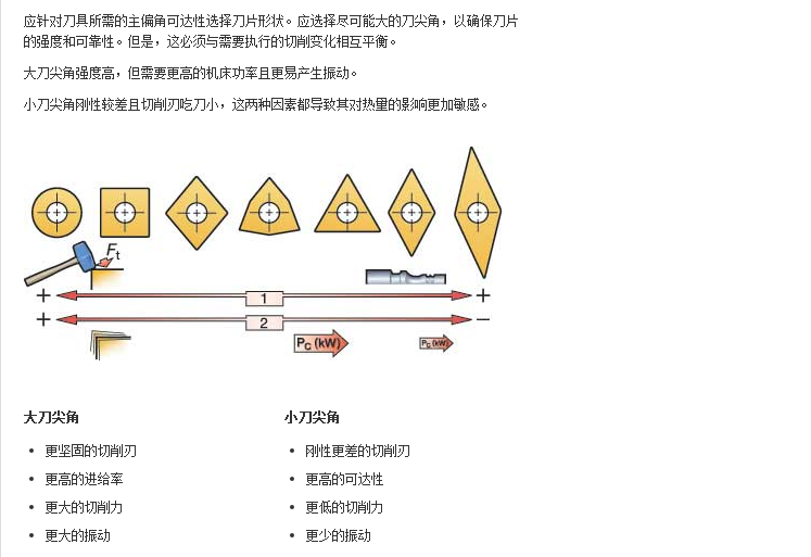 - 主偏角 (根据主偏角,切屑被引导至不同的方向;朝向肩部或从肩部向外)