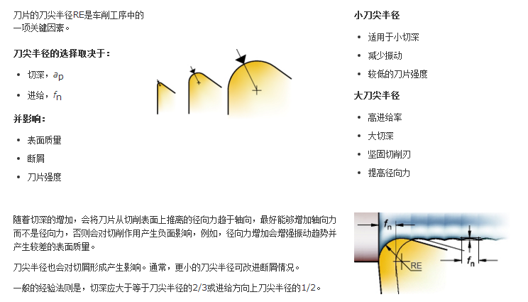 - 刀尖半径 (小刀尖半径对切屑的控制程度要高于大刀尖半径)